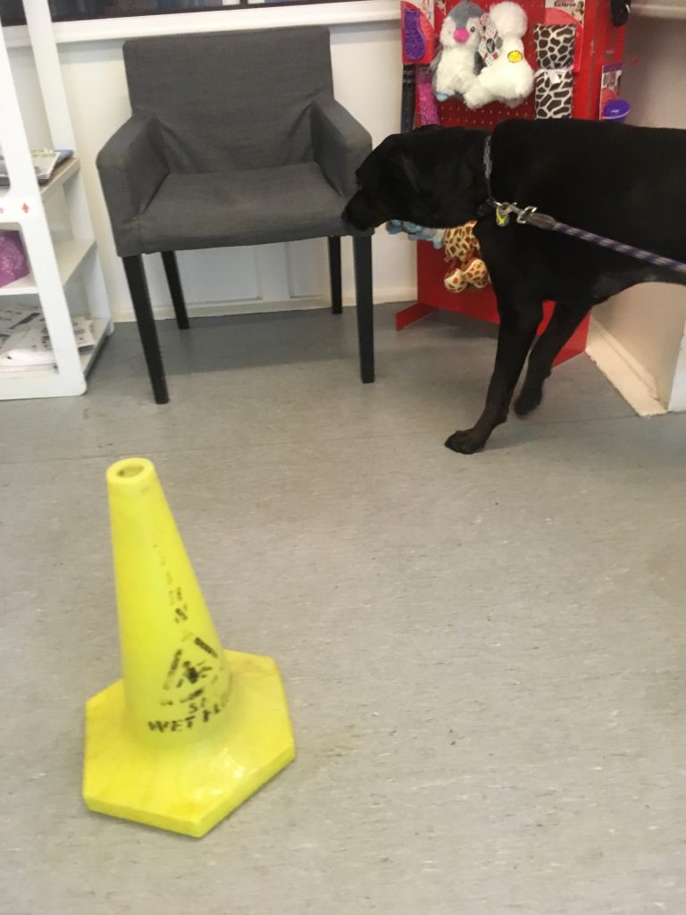 Sam had his final check-up last Friday. While in the vets’ waiting room, he spotted a cone on the floor, written on it was….Wet Floor….so he did! Sam cocked his leg and happily obliged! I was mortified, for there was no stopping him then, as he ran with it and took out the entire, beautifully-bagged biscuit display area too, who knew a dog could hold that much water!